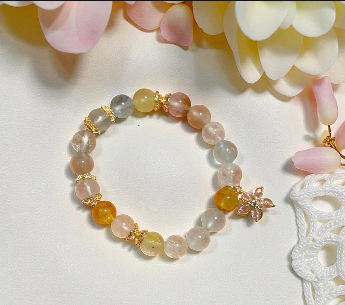 「晨曦花語」以蜜桃粉、淡黃與透明晶石串連,柔和而溫暖,象徵新生、希望與自我療癒。